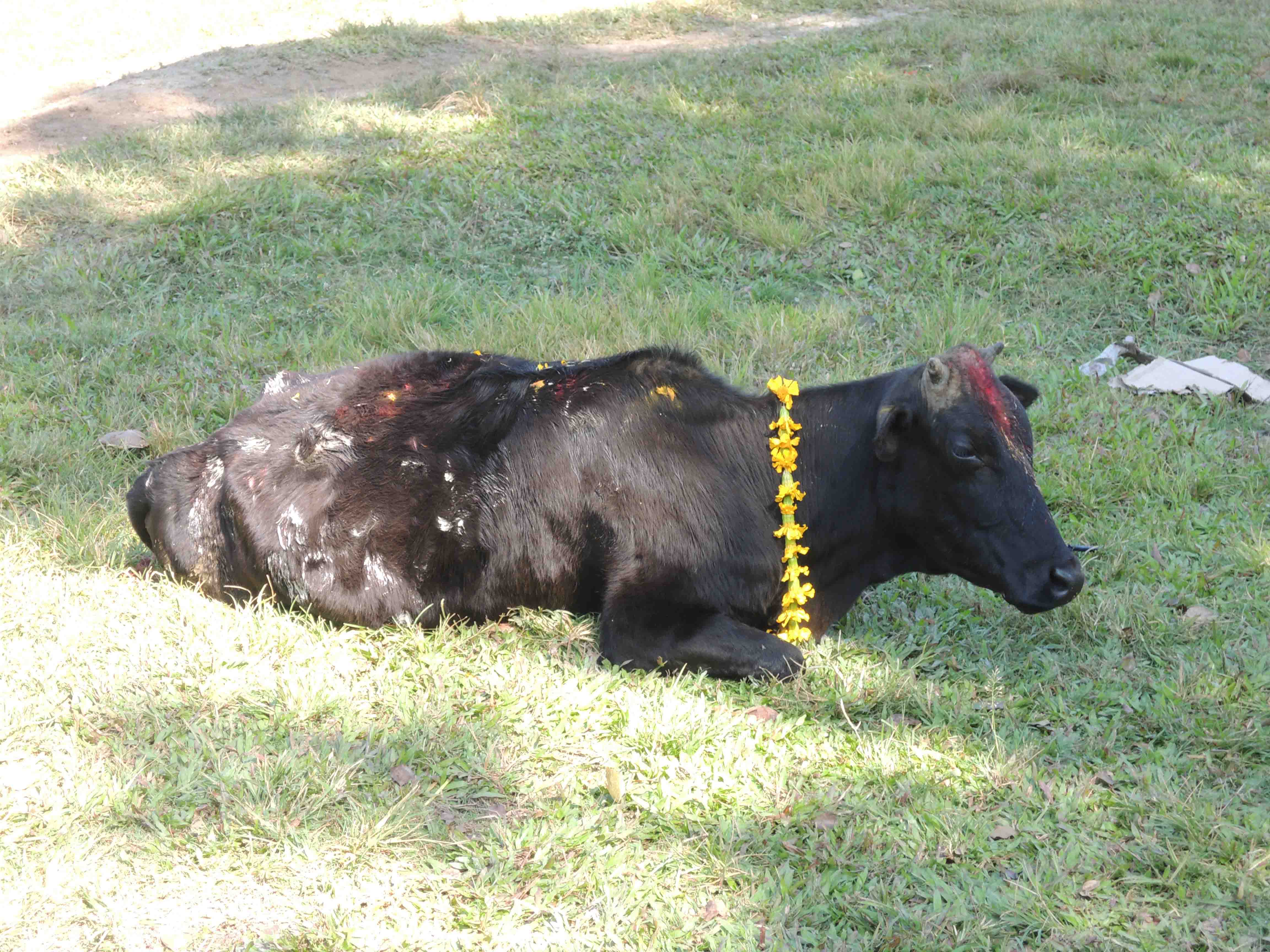 Neben dem Projekt stand unser Aufenthalt aber ganz im Zeichen von Dashain. Für unsere Freunde und Familien im Dorf war es eine große Freude und für uns eine riesige Ehre, die Feiertage gemeinsam zu zelebrieren. Speziell der 8te und 9te Tage des Festivals sind die Tage des „Schneidens“, wie die Nepalesen es nennen. Ein Wasserbüffel verlor vorm Haus der Nachbarn zuerst mit einem gezieltem Schlag seinen Kopf und wurde anschließend zerlegt.