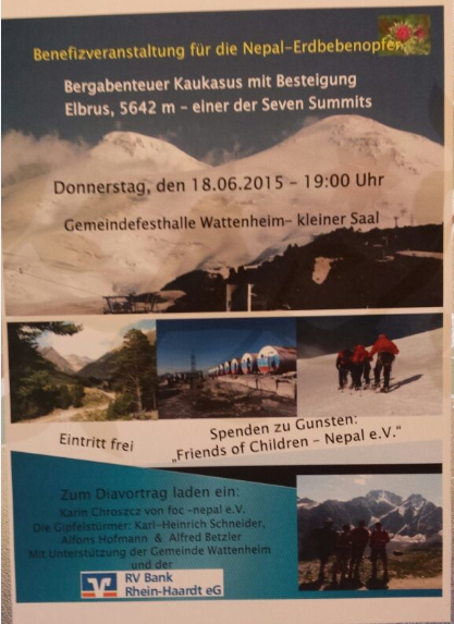 Am Donnerstag, den 18. Juni wird Karin im Rahmen einer Benefizveranstaltung für die Erdbebenopfer in Nepal gemeinsam mit den Bergsteigern Karl-Heinrich Schneider, Alfons Hofmann & Alfred Betzler über Nepal und die Projekte von FoC-Nepal e.V. informieren. Der Erlös dieser Veranstaltung geht an FoC – Vielen Dank an die Organisatoren! Die Ve…ranstaltung findet in der Gemeindefesthalle in Wattenheim statt.